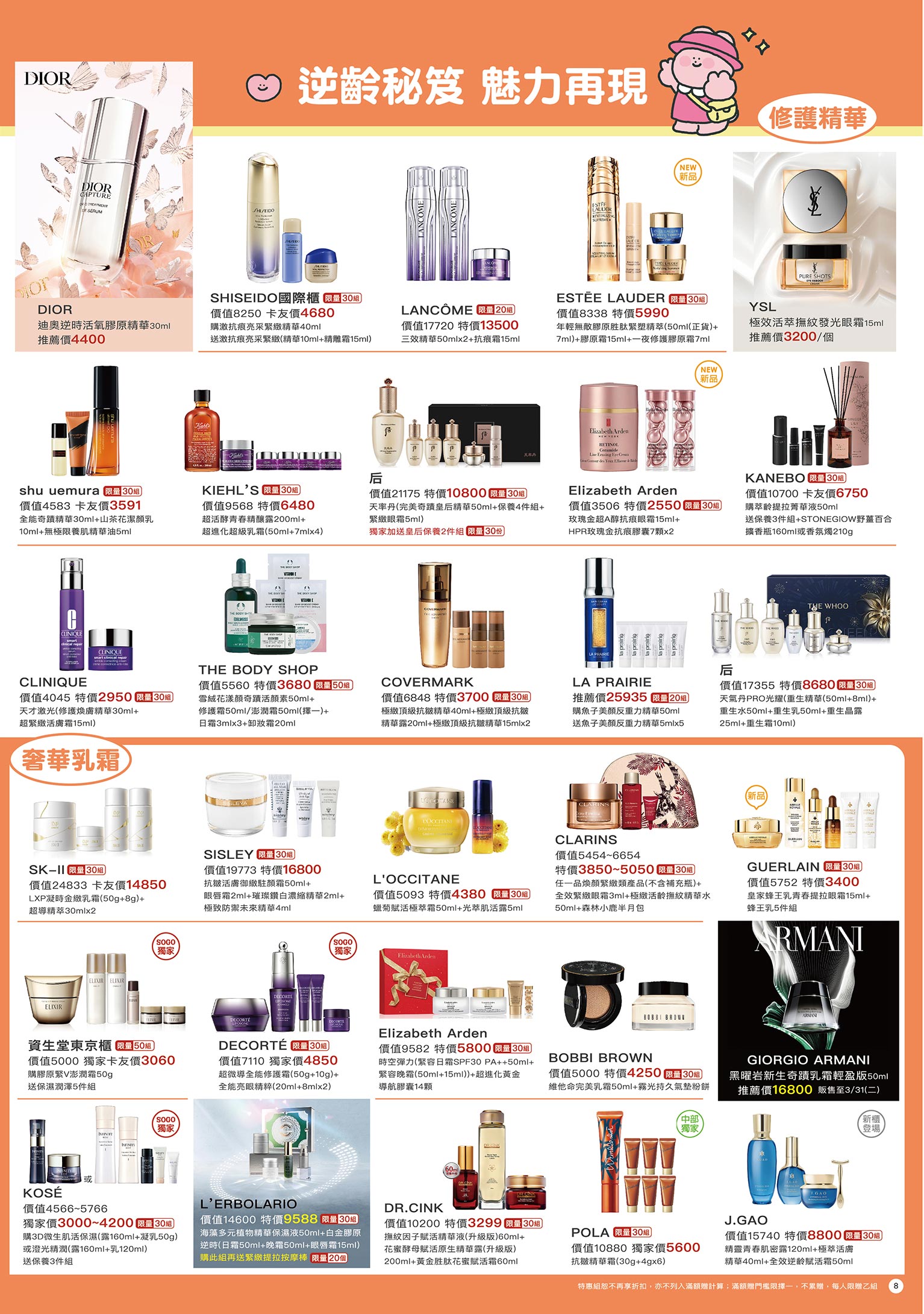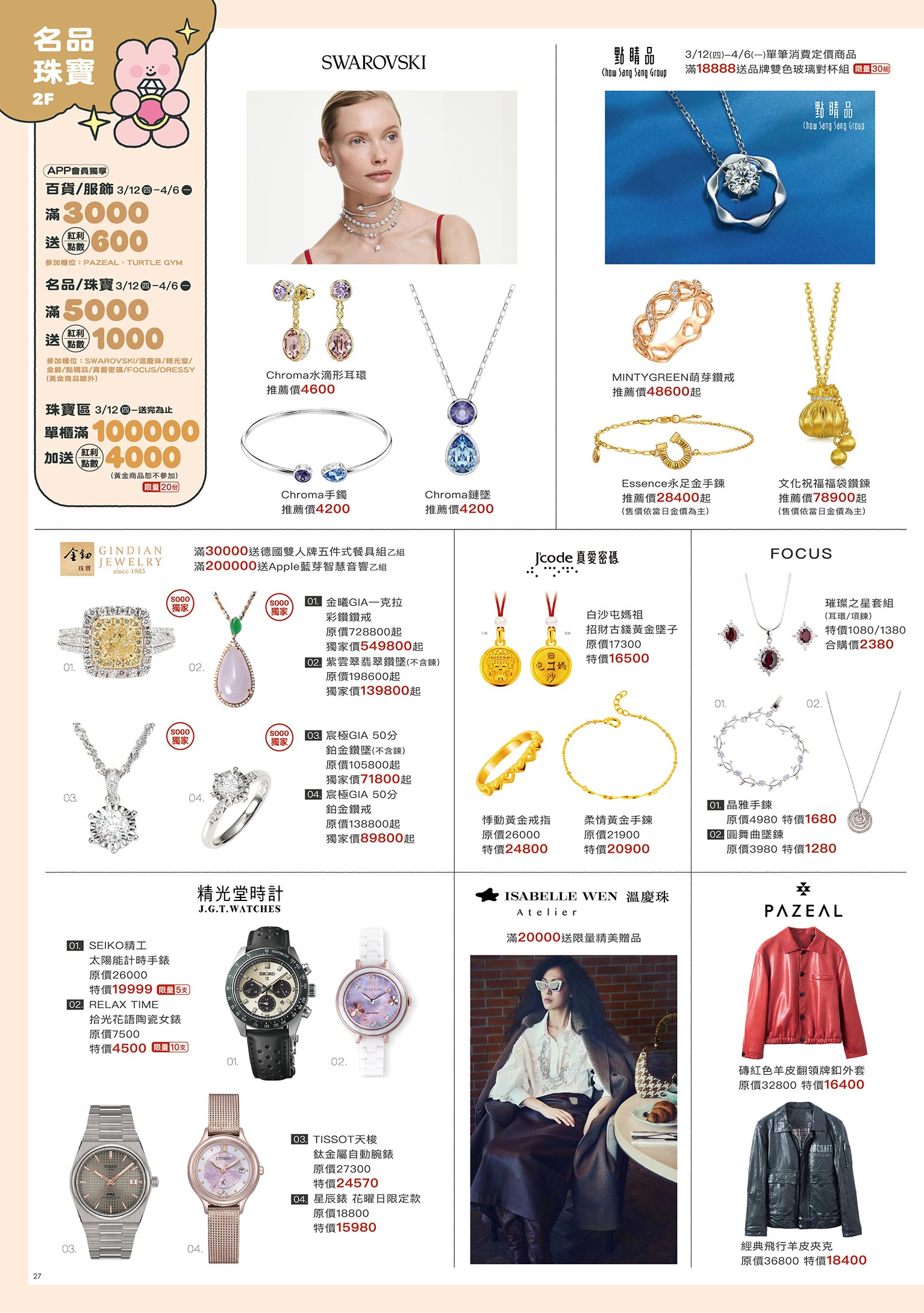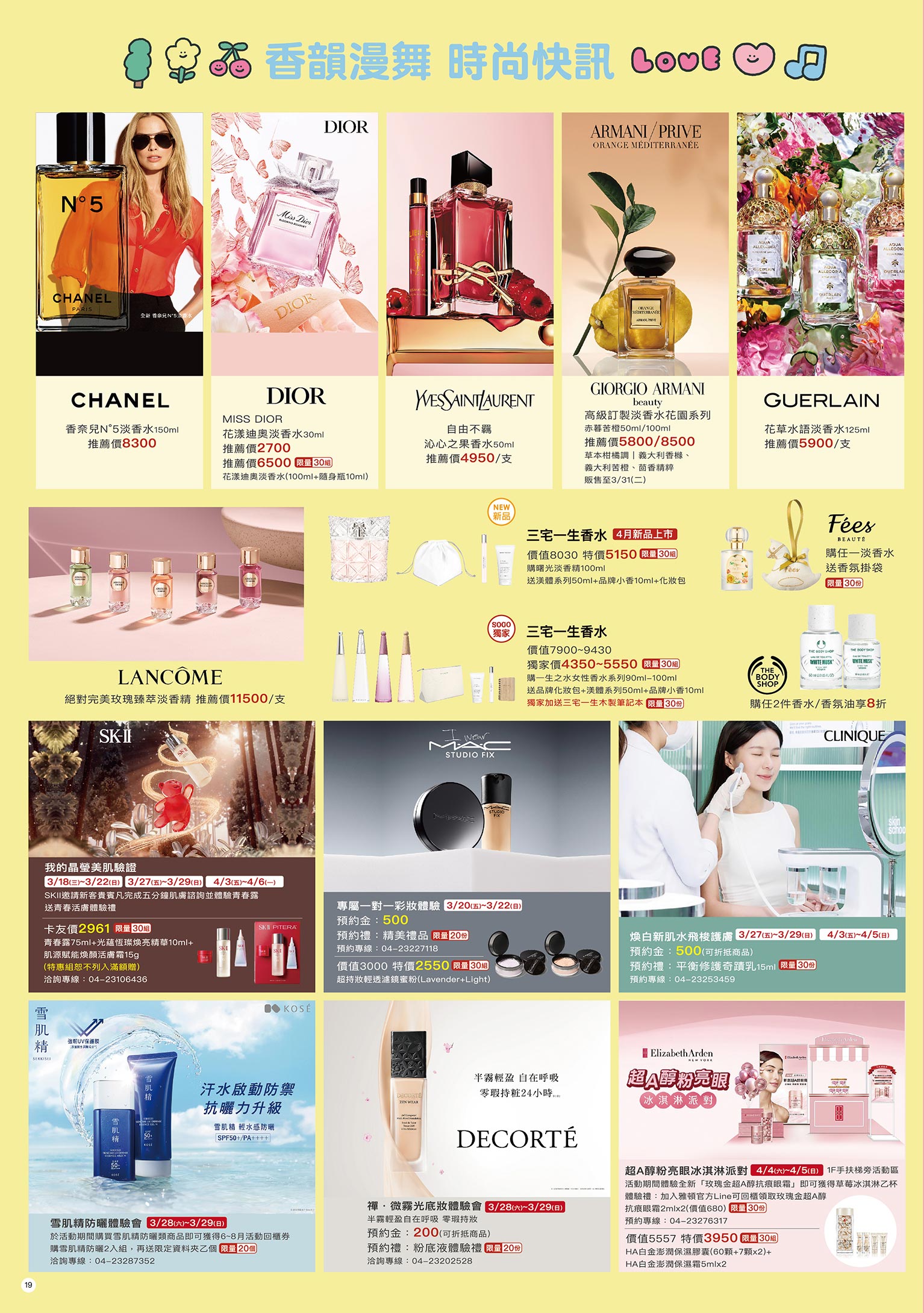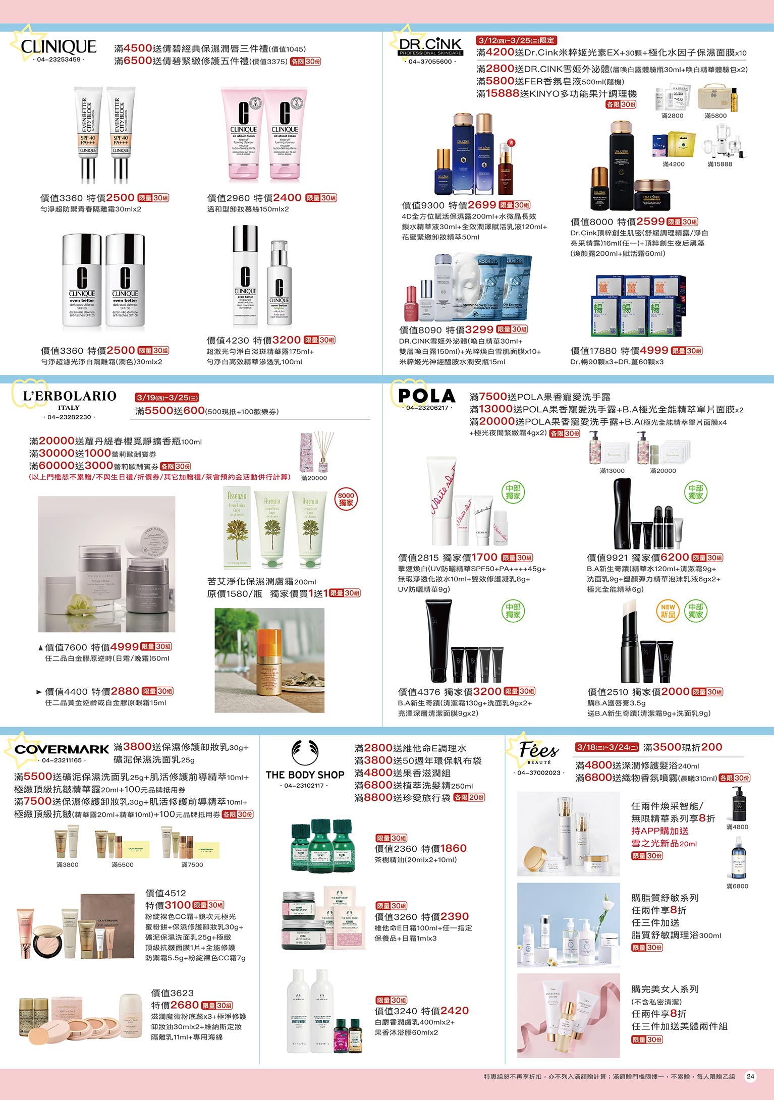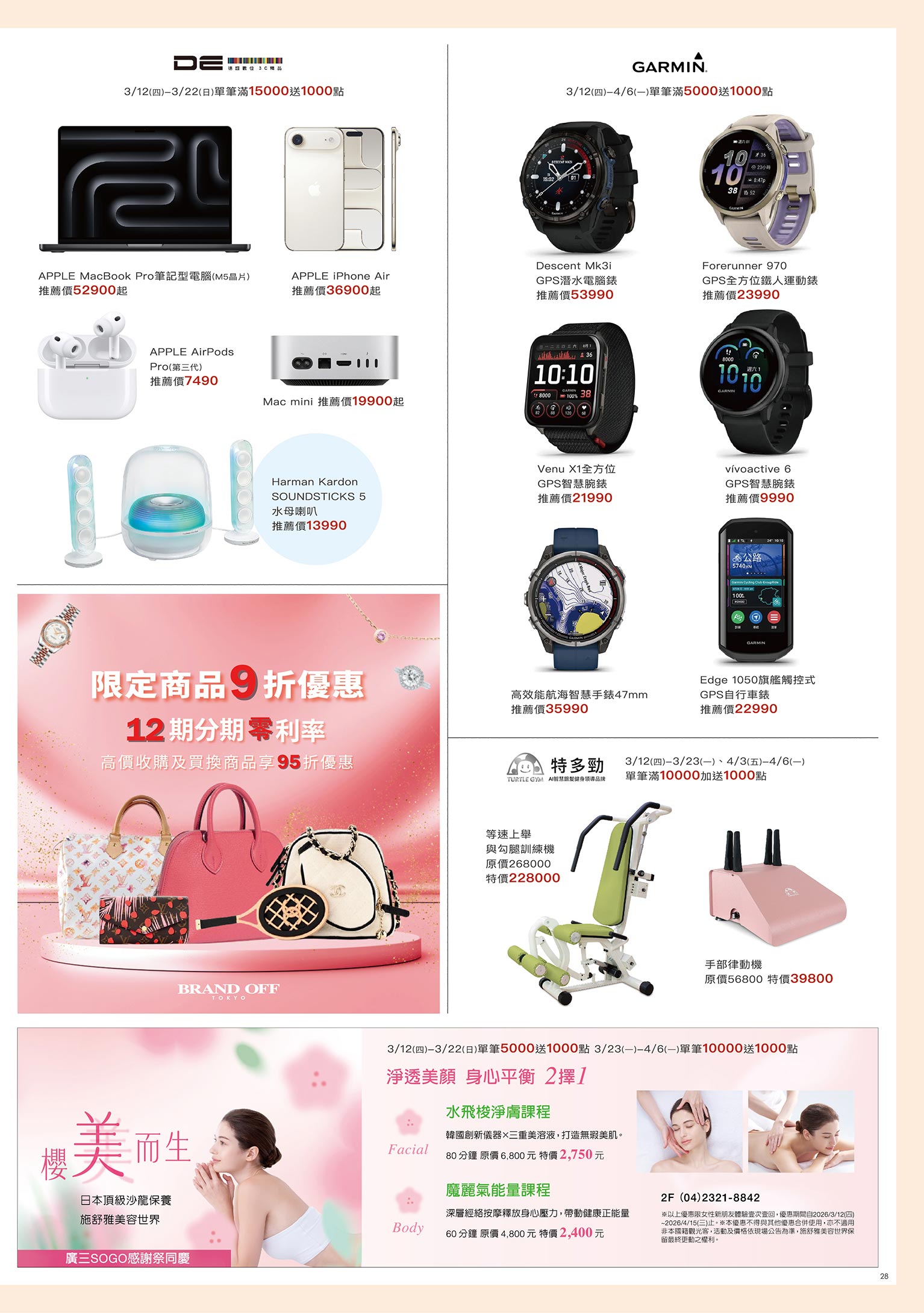 • 化妝品: 3/12~4/6 滿2000送400點 ;• 化妝品加碼: 3/12~3/26 滿10000加送600點• 新櫃登場:CbGaRDN、J.GAO