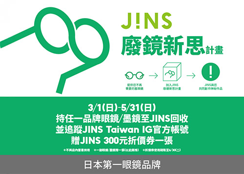 活動期間持任一品牌眼鏡 / 墨鏡至JINS回收,並追蹤JINS Taiwan IG官方帳號即贈JINS 300元折價券一張。