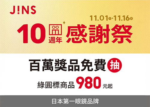 活動期間至JINS門市,出示追蹤 JINS Taiwan IG 的畫面,就有機會獲得最大獎 iPhone 17 Pro!還有超多豐富好禮,就等你帶回家!十年才一次的盛大慶典,絕對不能錯過~快揪朋友一起來JINS配鏡、試手氣!