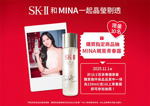 活動期間於1F SK-II專櫃單筆買任兩件商品,其一需含青春露230ml(含)以上,即可參加SK-II x Mina親簽青春露230ml抽獎資格一次(一單限一次,同消費者可重複參加)。